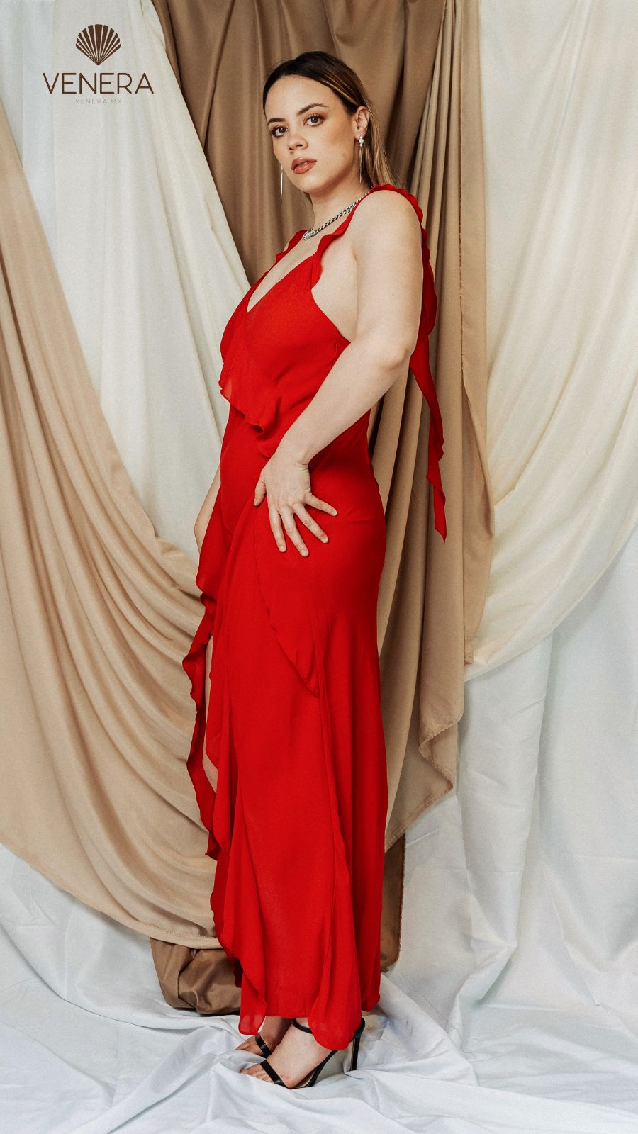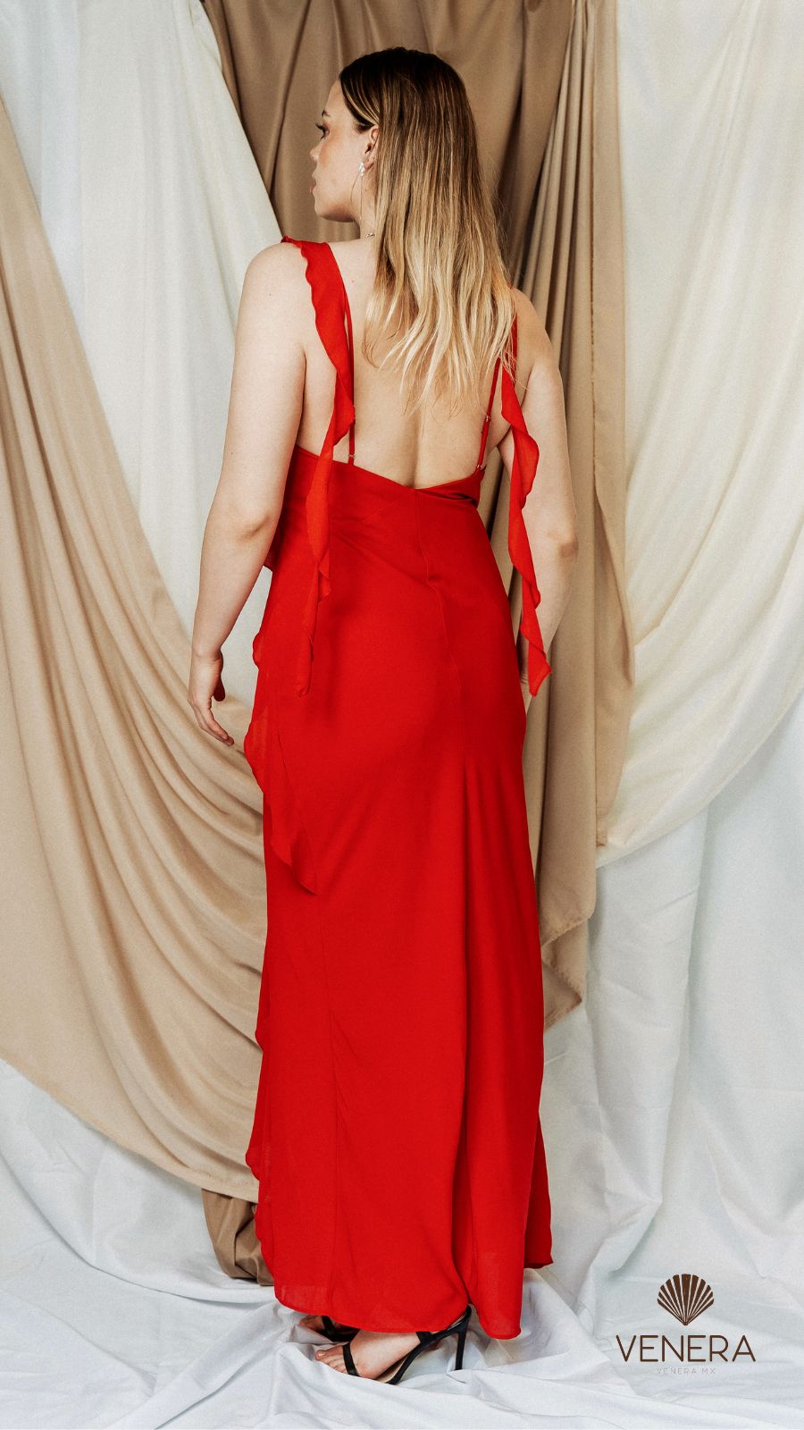 Vestido asimétrico estilo corte sirena con holanes y escote V.