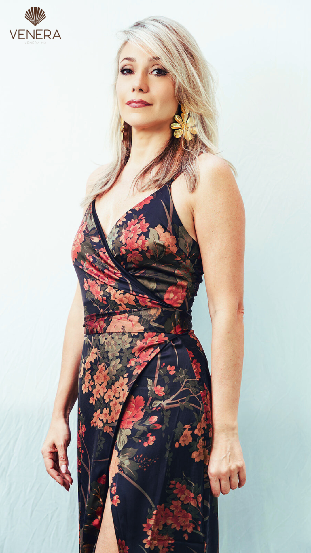 Vestido con escote V, de color negro y estampados florales, está a la altura del tobillo y cuenta con una tenue apertura en la pierna.