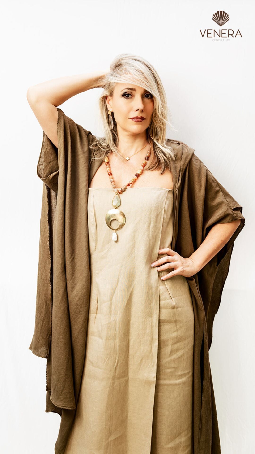 Jumpsuite de lino color arena que por delante da la percepción de un vestido largo, creando la combinación perfecta entre libertad, elegancia y comodidad.
