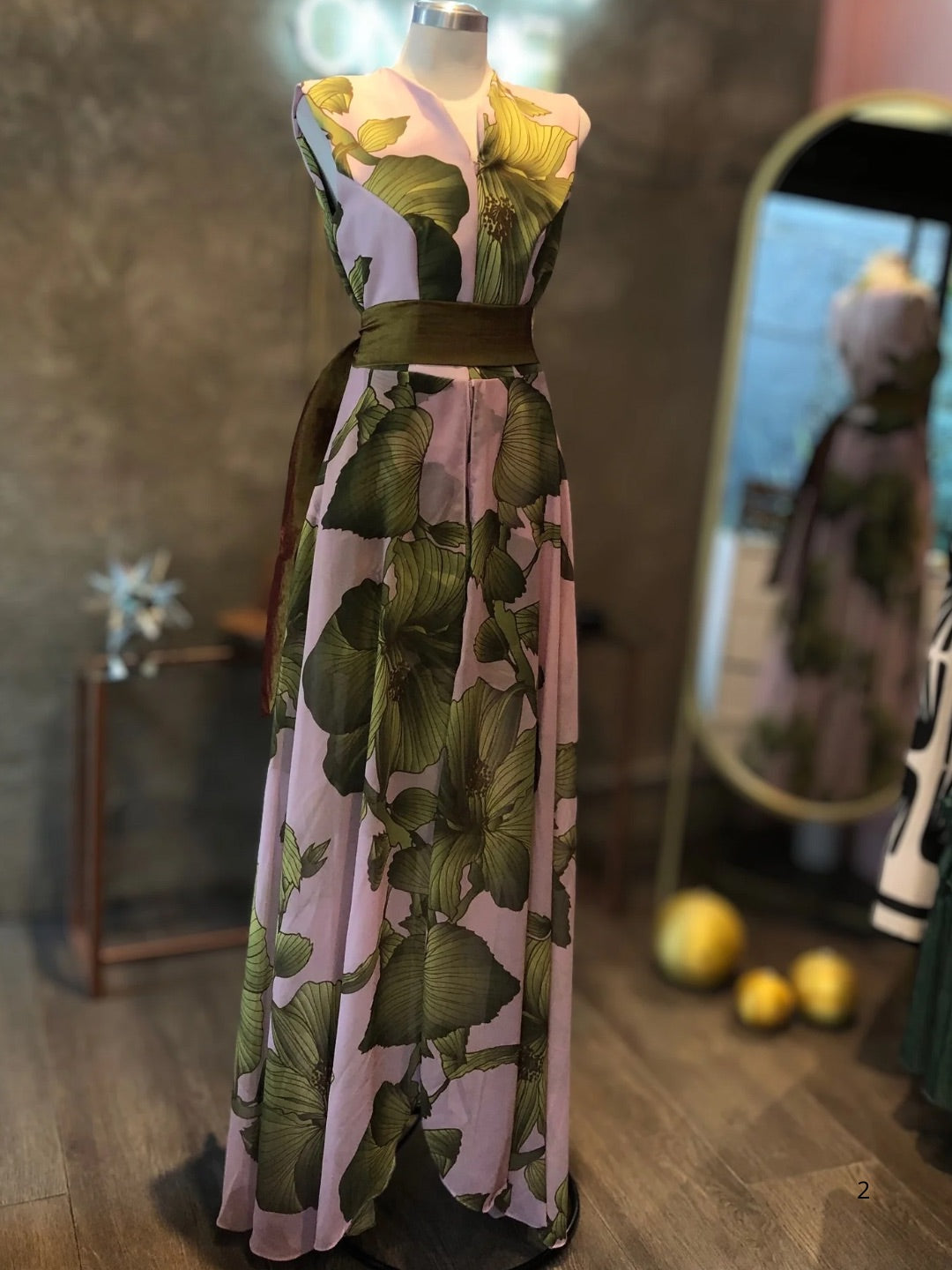 Vestido versátil color rosa con verde, con ligera transparencia, diseño exclusivo para eventos formales o casuales.