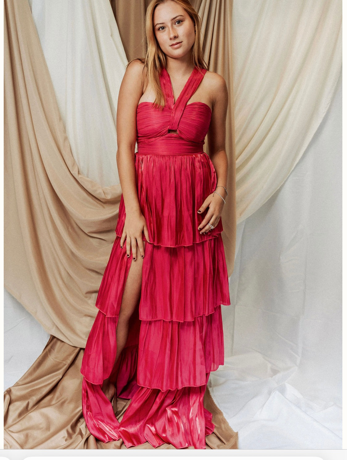 Vestido largo de cintura alta y escote halter,  apertura a media pierna y falda de volantes. Inspirado en la belleza de la cultura grecorromana y un color que denota feminidad y glammour.